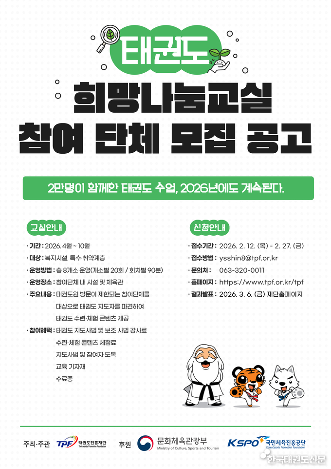 한편, 2026 태권도 희망나눔 교실과 관련한 자세한 사항은 태권도진흥재단 및 태권도원 누리집 공지사항에 게시된 내용을 참고하면 된다.