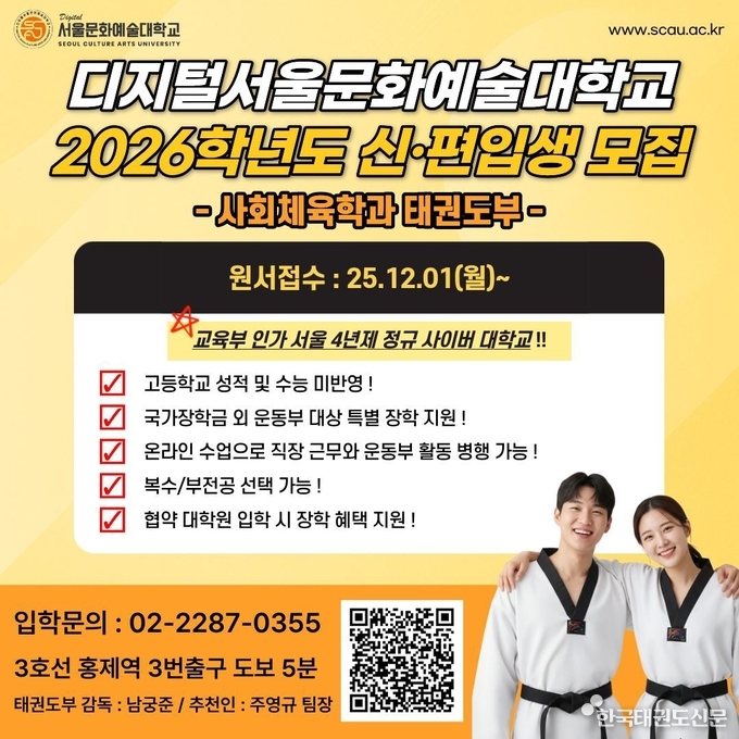 [한국태권도신문] 한국태권도지도자협회(회장 남궁준)는 디지털서울문화예술대학교 사회체육학과 내에 ‘태권도부’가 2026학년도부터 공식 신설된다고 13일 밝혔다.