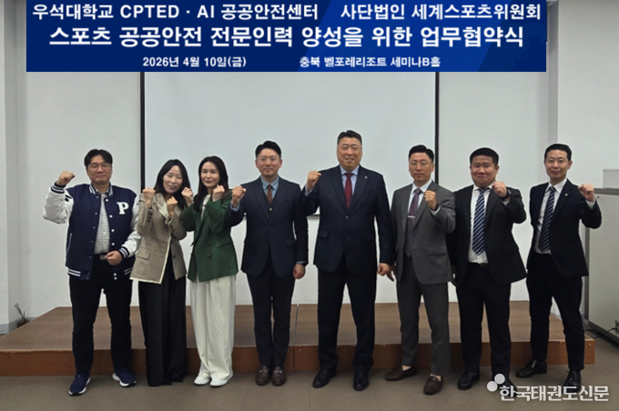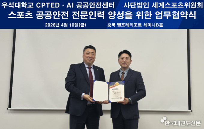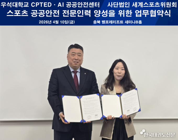 [한국태권도신문] 사단법인 세계스포츠위원회(위원장 서현석, 이하 ‘위원회’)는 우석대학교 CPTED·AI 공공안전센터(센터장 엄유진)와 스포츠 발전 및 공공안전 전문인력 양성을 위한 업무협약(MOU)을 체결했다.