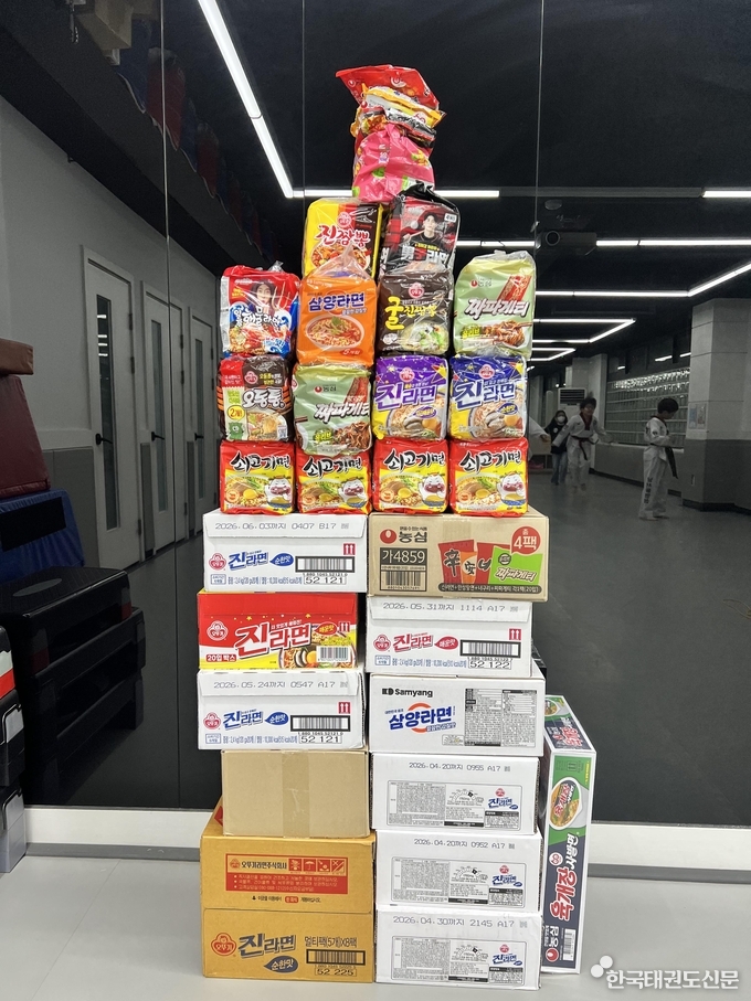 [한국태권도신문] 서울 금천구 시흥동에 위치한 남서울명성태권도(관장 엄주용)는 지난 23일(화) 도장 내에서 ‘사랑의 라면트리’ 기부 행사를 진행하고 라면 424개를 지역 어르신들을 위해 금천노인종합복지관에 전달했다.