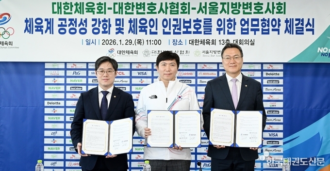 [한국태권도신문] 대한체육회(회장 유승민)는 1월 29일(목) 대한변호사협회(협회장 김정욱), 서울지방변호사회(회장 조순열)와 체육계 공정성 강화 및 체육인 인권보호를 위한 업무협약을 체결했다.